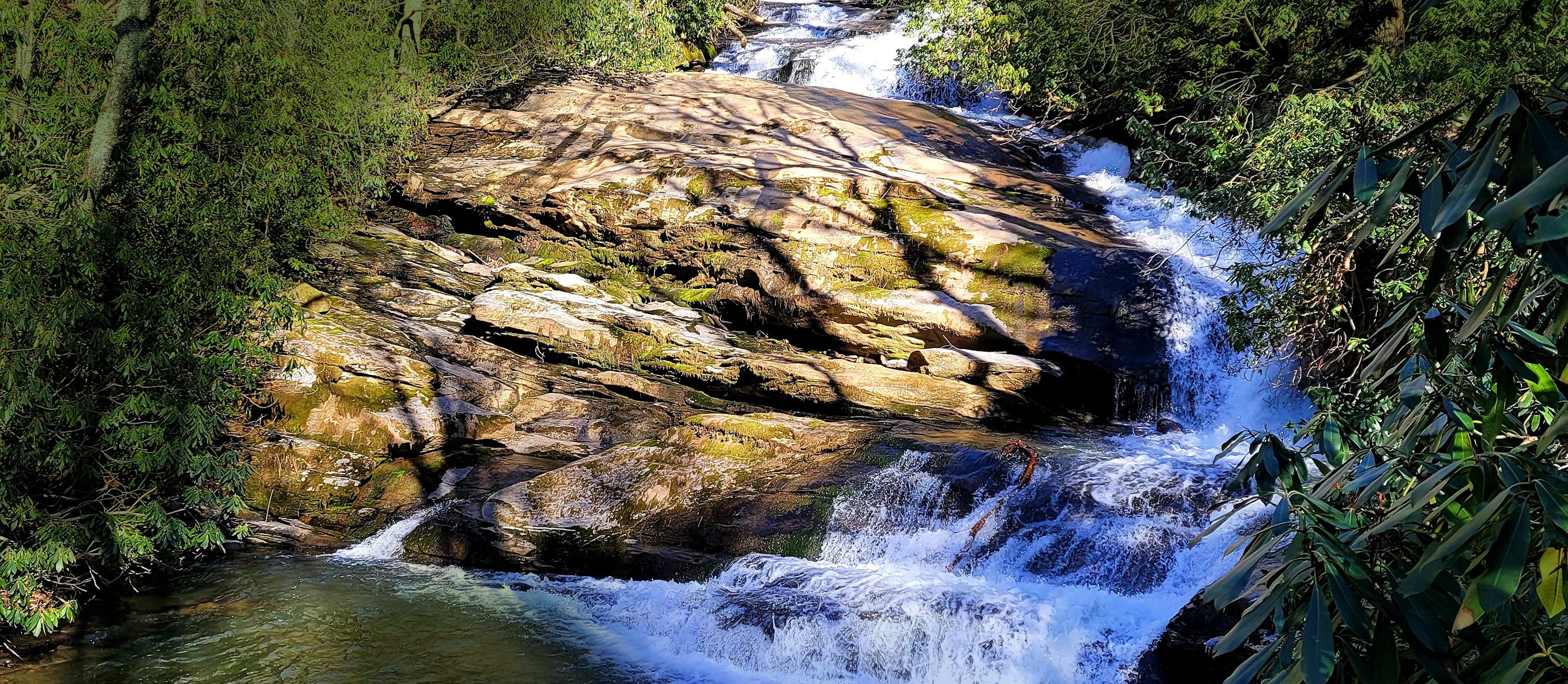 The trail leads to a sliding waterfall that was once the site of a hidden moonshine still, back when locals hauled supplies through these same woods on foot.